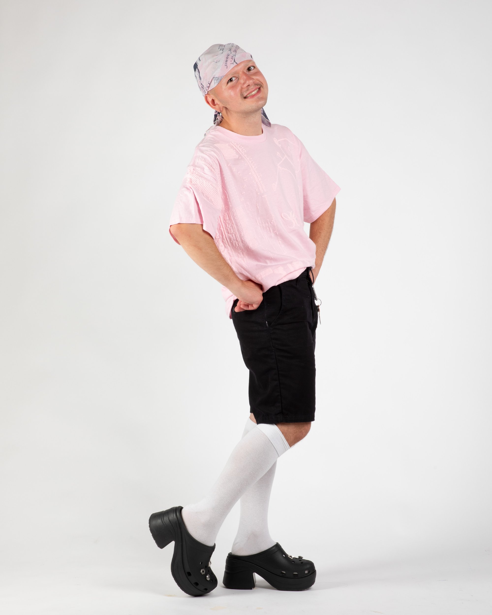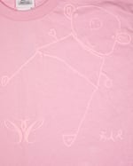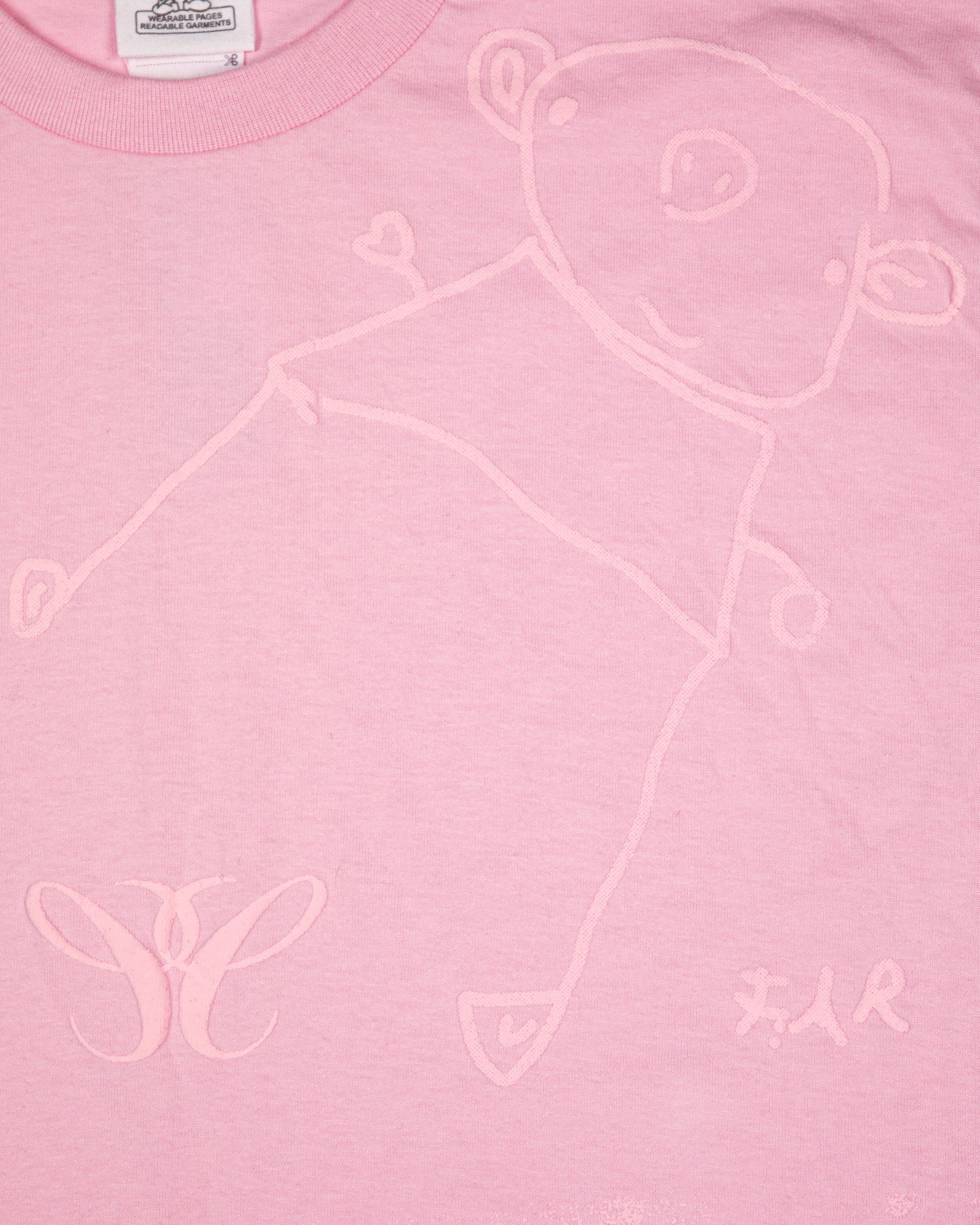 Pink T-shirt 100% cotton printed with puffing ink mixed with white water-based ink. Tactile, puffy print.