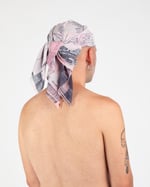 Recycled polyester, double face foulard printed with two layers of sublimation print, 75x75 cm. The artwork has been layered analogically on the printing table and then heat pressed. The piece has two different artworks on the front and back, that merge into each other and are visible on each side thanks to the recycled polyester transparency.